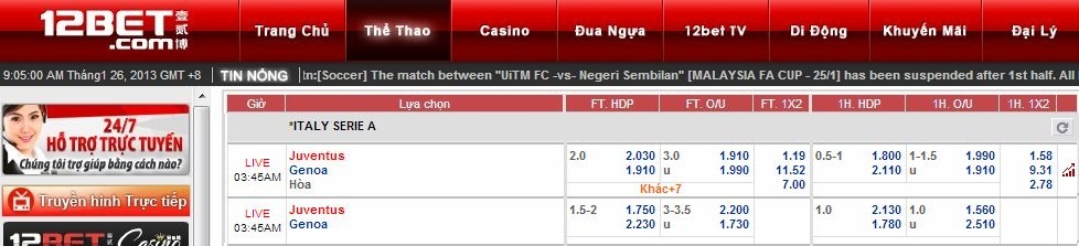 Tỷ lệ kèo chấp cực tốt từ 12BET
