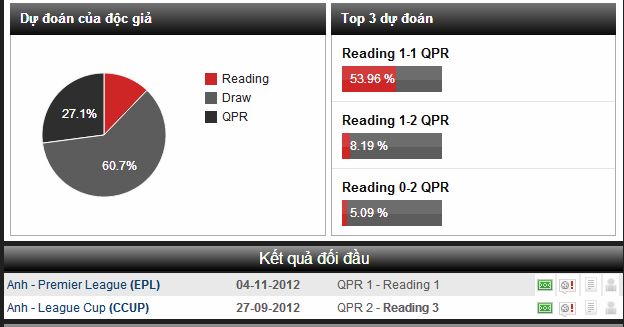 Trong khi đó, dù cũng mang tâm trạng chán nản và thành tích tụt dốc nhưng Reading lại có điểm tựa sân nhà. Trước khi buông xuôi, họ từng có chuỗi 6 trận bất bại (4 thắng) tại Madejski Stadium. Và cộng với việc QPR đã thất thủ 3/5 trận đối đầu gần nhất tại đây, nhiều khả năng The Royals sẽ giành điểm tối đa.